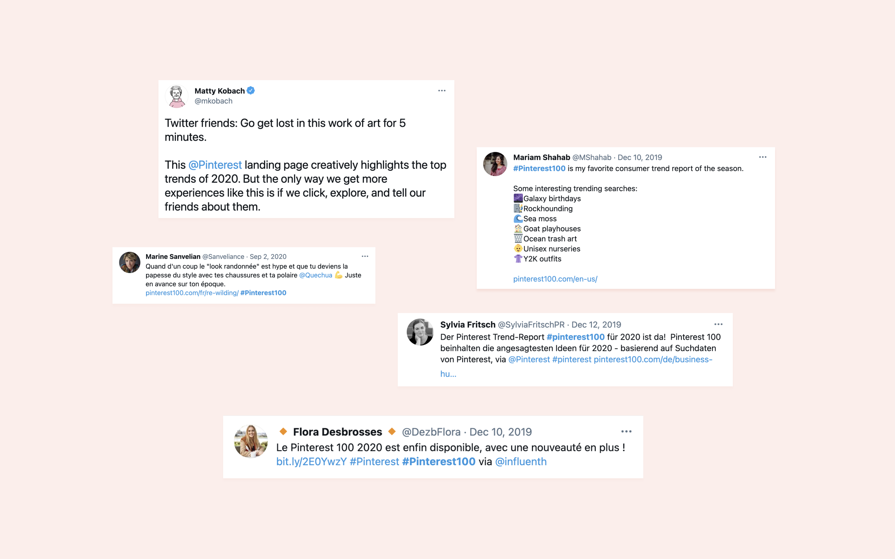 We wanted to make sure the themes have a very editorial look and feel so they can convey that these Pinterest searches are actually happening in the real world and are relatable to the user. Pinterest 100 was launched globally so the design needed to be flexible to be translated into 8 different languages.